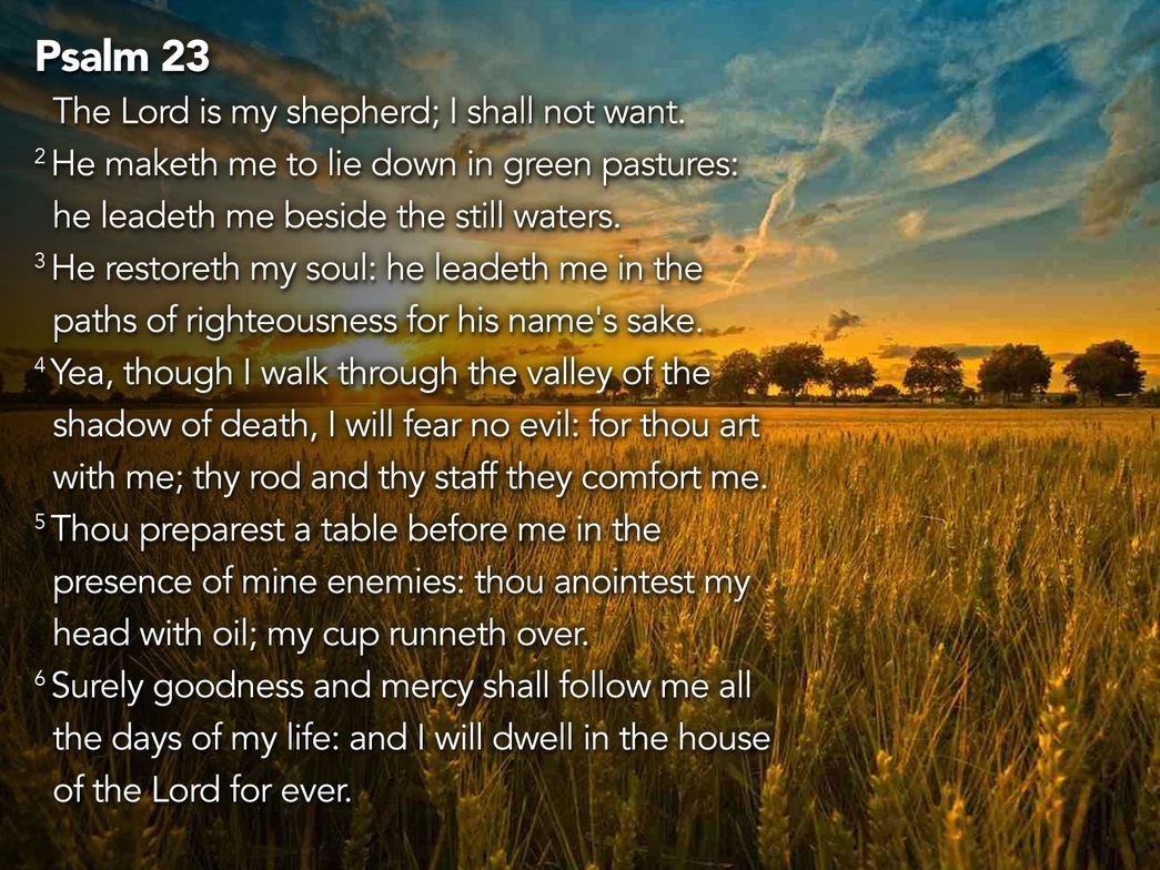 Even though I walk through the valley of the shadow of death, I will fear no evil, for you are with me;